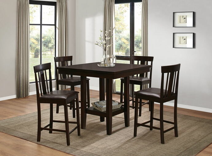 5 pc Diego collection warm brown finish wood counter height dining table set with upholstered seats. This set includes the table, 4 – side chairs with upholstered seats. Table measures 39″ x 39″ x 36″ H. Side chairs measure 17″ x 19″ x 39″ H. Additional chairs also available separately. Some assembly required.