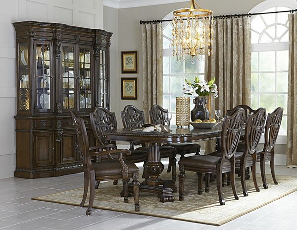 7 pc Chilton cherry finish wood double pedestal dining table set. This set includes the table with two leaves , 2 -arm chairs, and 4 – side chairs with padded seats and tufted backs. Table measures 48″ x 76″ L ( 112″ L with 2 – 18″ leaves). Arm chairs measure 25″ W x 27″ x 41″ H. Side chairs measure 21″ x 27″ x 41″ H. Additional chairs and Buffet also available separately. Some assembly required.