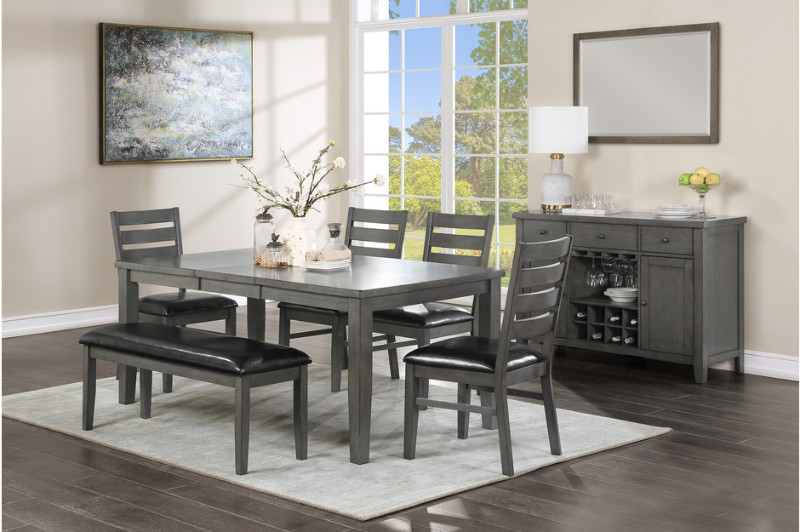 5693-6PC 6 pc Canora grey holders weathered gray finish wood dining table set with bench. This set features a dining table , bench and 4 – side chairs. Table measures 36″ x 60″ x 30″ H. Side chairs measure 18″ x 20.5″ x 39.5″ H. Bench measures 46.5″ x 16″ x 20″ H. Some Assembly Required.