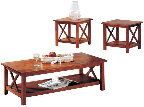 Source: 5907C 3 pc brown finish wood coffee and end table set with cross design legs