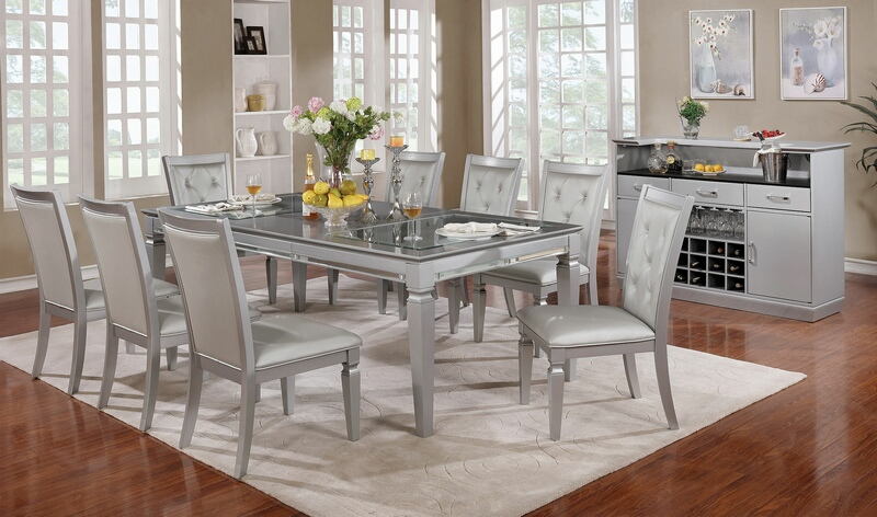 7 pc Alena collection silver finish wood dining table set glass and mirror top. This set includes the table with mirror and glass, 6 – side chairs with silver finish wood and leatherette upholstered chairs. Dining table measures 66″ (84″ with 1 – 18″ leaf) x 42″ x 30″ H. Side chairs measure 20 1/8″ x 25″ x 39″ H. Additional pieces also available separately at additional cost. Some assembly required.