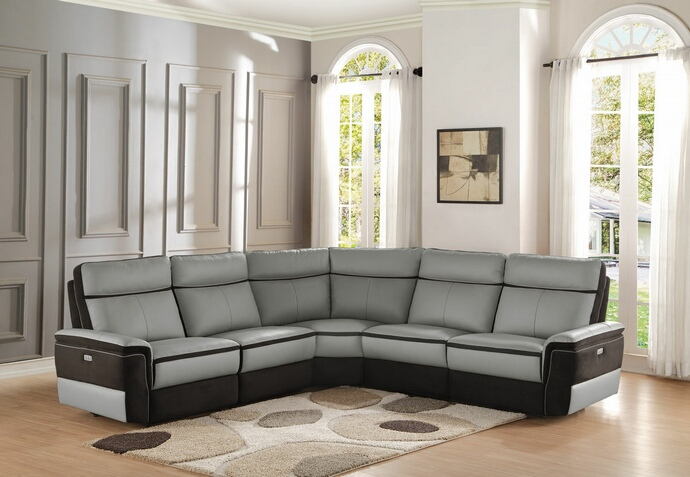 5 pc Laertes collection two tone grey top grain leather and darker tone fabric upholstered power reclining sectional sofa. This set features a two tone leather and fabric upholstery with power recliners on the ends. Sectional measures 116″ x 116″ x 37″ x 39″ H. Some assembly required.