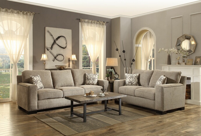 2 pc Gowan collection brown chenille fabric upholstered sofa and love seat set with nail head trim. This set includes the Sofa and Love seat with nail head trim . Sofa measures 95″ x 40″ x 38″ H. Love seat measures 69″ x 40″ x 38″ H. Optional accent chair also available separately at additional cost and measures 55″ x 38″ x 38″ H. Some assembly required.