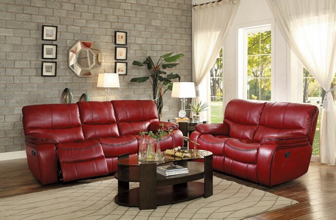 2 pc Pecos Collection contemporary style red leather gel match motion sofa and love seat set. This set features a Sofa and Love seat with recliners on each end of each piece. Sofa measures 88″ x 40″ x 39″ H. Love seat measures 65″ x 40″ x 39″ H. Additional single recliner also available at additional cost and measures 42″ x 40″ x 39″ H. Some assembly required.