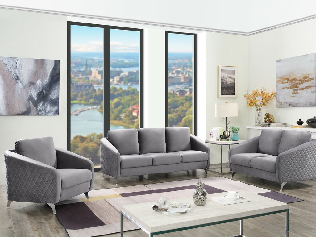 Source: 89720 2 pc Sofia grey velvet fabric diamond pattern sofa and love seat set with metal legs