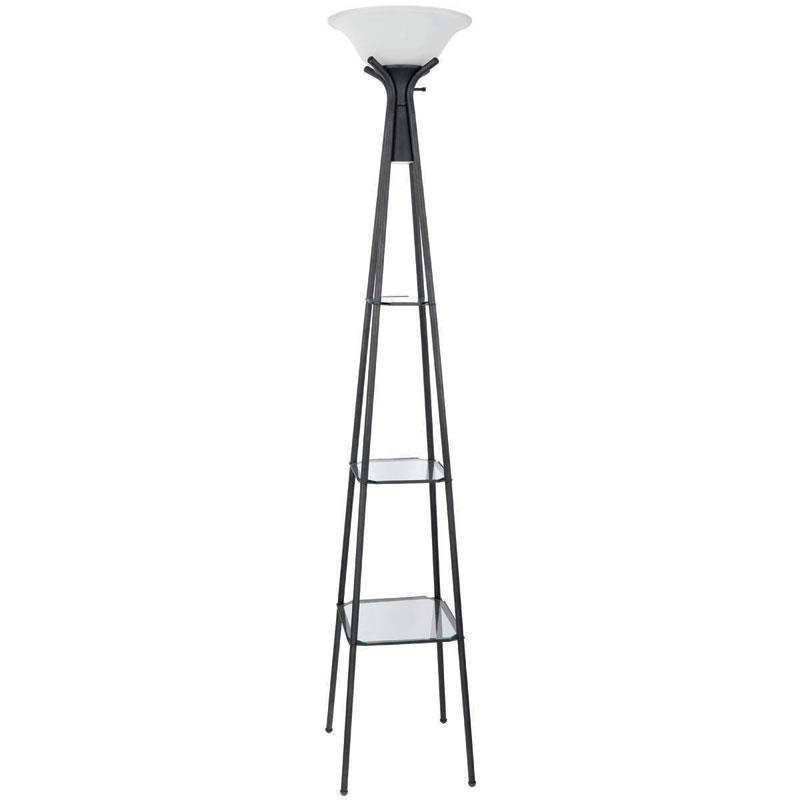 Charcoal black finish transitional casual style floor lamp with glass shelves. Features clear glass shelves with additional down lighting on shelves. Lamp measures 15″ x 15″ x 61″ H. Some assembly required.