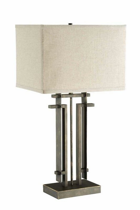 Metallic finish base table lamp with beige rectangular fabric shade. Lamp measures 15″ x 8.5″ x 29.5″ H. Some assembly required.