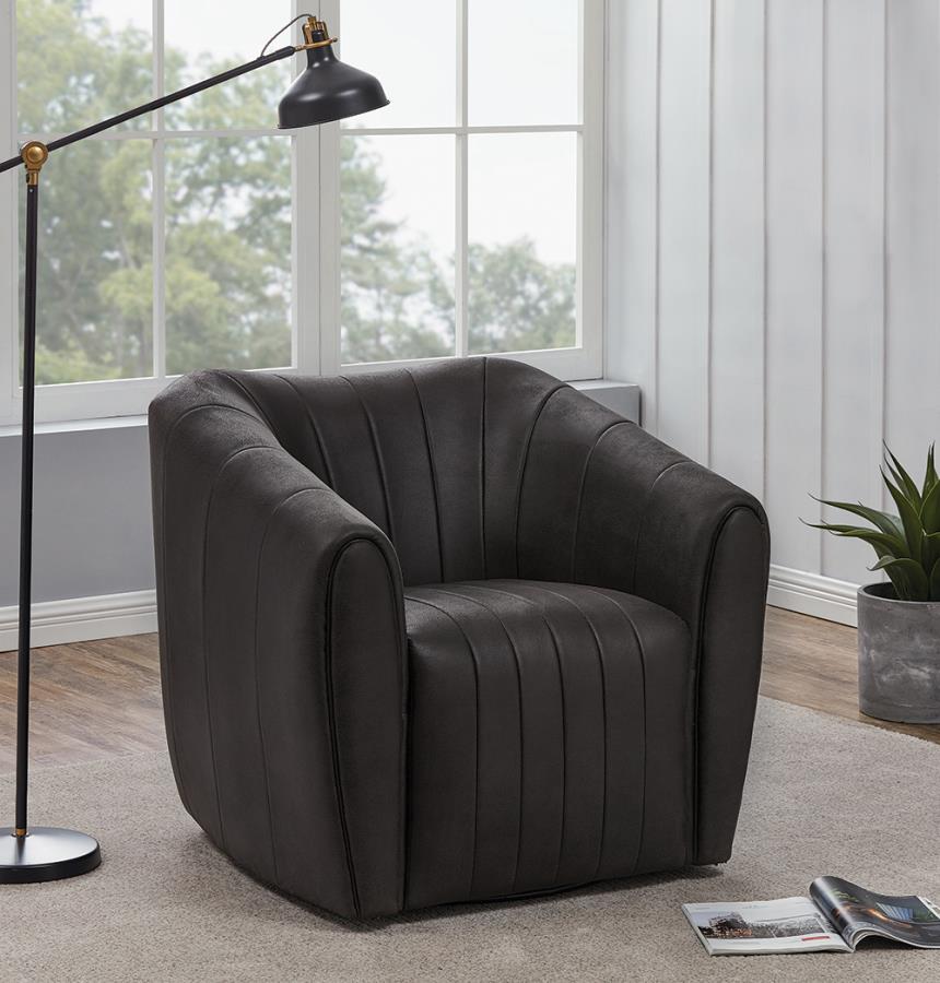 904123 Latitude run brown faux leather barrel shaped accent side chair with swivel base. Chair Measures 36″ x 35.75″ x 32.5″ H. Some assembly required.
