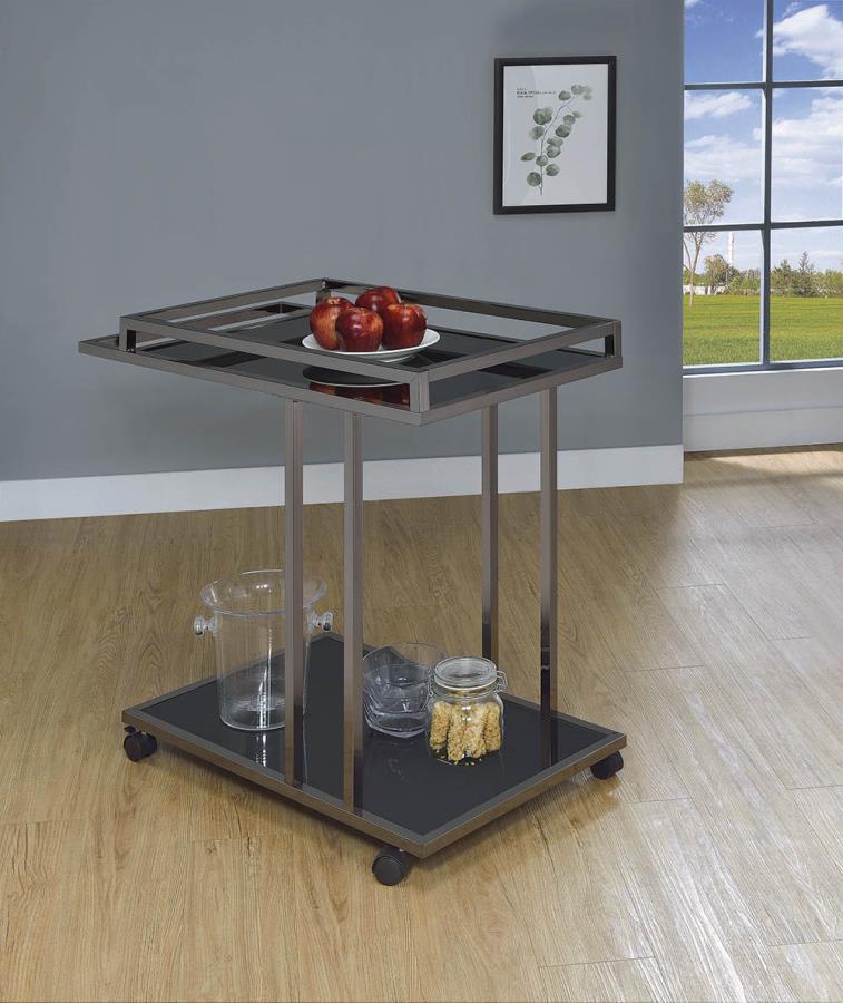 Black nickel metal frame black glass shelves tea serving cart with casters. Measures 32″ x 18″ x 30″ H. Some assembly required.