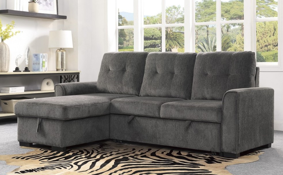 9402DGY*SC Winston porter cadence II dark gray fabric reversible sectional sofa with storage chaise. Features a reversible chaise with storage , pull out sleep area and adjustable headrests all with pocket coil seating. Measures 91.5″ x 61″ x 38″ H. Some assembly required.