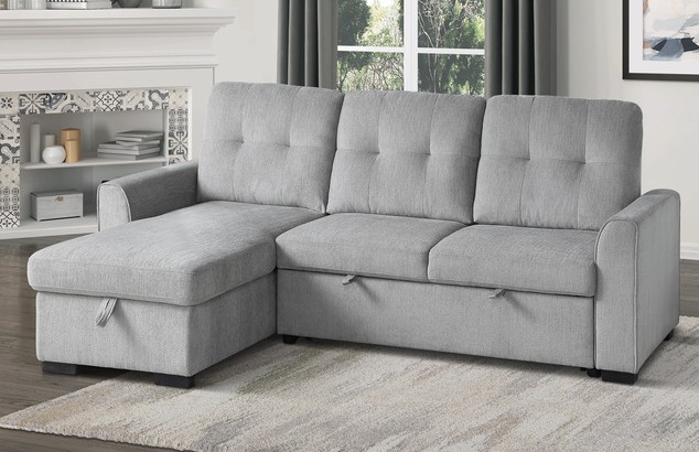 9402GRY*SC Winston porter cadence II gray fabric reversible sectional sofa with storage chaise. Features a reversible chaise with storage , pull out sleep area and adjustable headrests all with pocket coil seating. Measures 91.5″ x 61″ x 38″ H. Some assembly required.