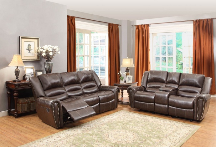 2 pc center hill dark brown bonded leather match sofa and love seat nail head trim. This set includes the Sofa and Love seat with center console with recliners on the ends and overstuffed arms and nail head trim. Sofa measures 90″ x 38.5″ x 40″ H. Love seat measures 83″ x 38.5″ x 40″ H. Single recliner chair also available separately and measures 42″ x 38.5″ x 40″ H. Some assembly required.