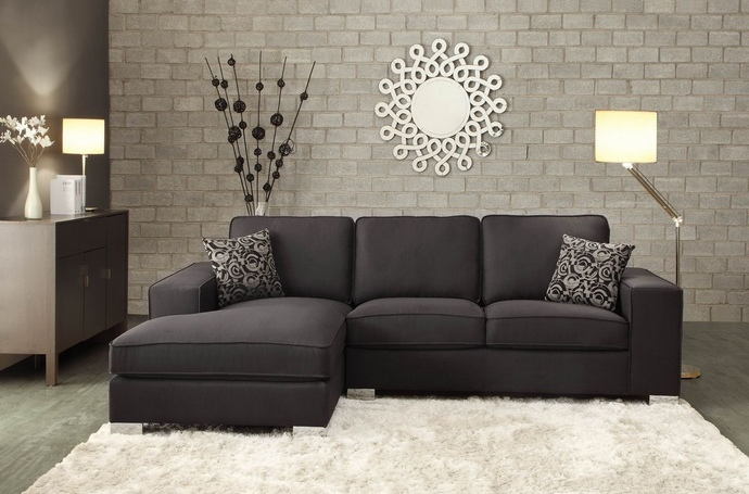 2 pc Kamea collection black linen like fabric upholstered sectional sofa set with square arms and chaise. This set comes with a RAF Sofa and a LAF chaise with chrome legs and fabric upholstery. Sectional measures 111.5″ x 65.5″ x 36.5″ H. Some assembly required.