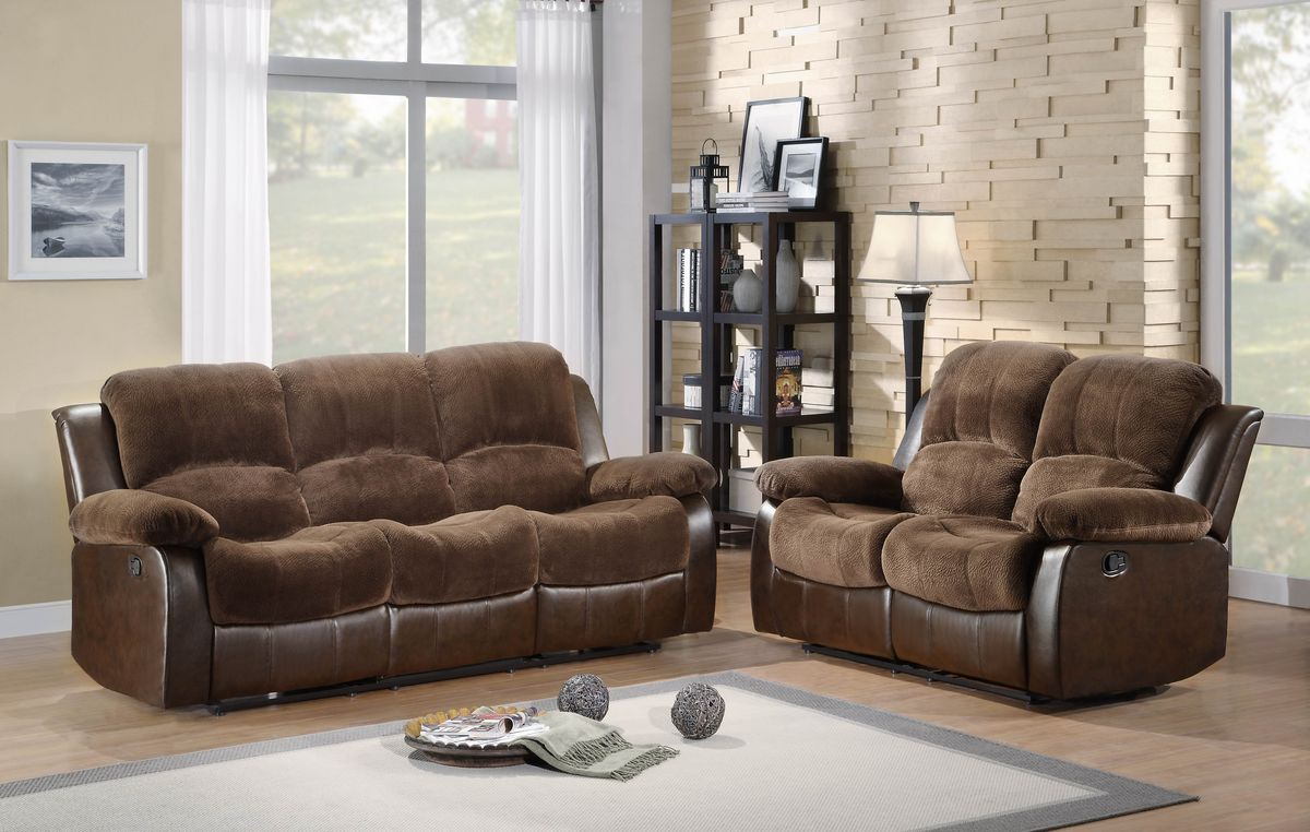 Source: 9700FCP 2 pc cranley collection 2 tone chocolate textured microfiber and brown faux leather upholstered double reclining sofa and love seat set