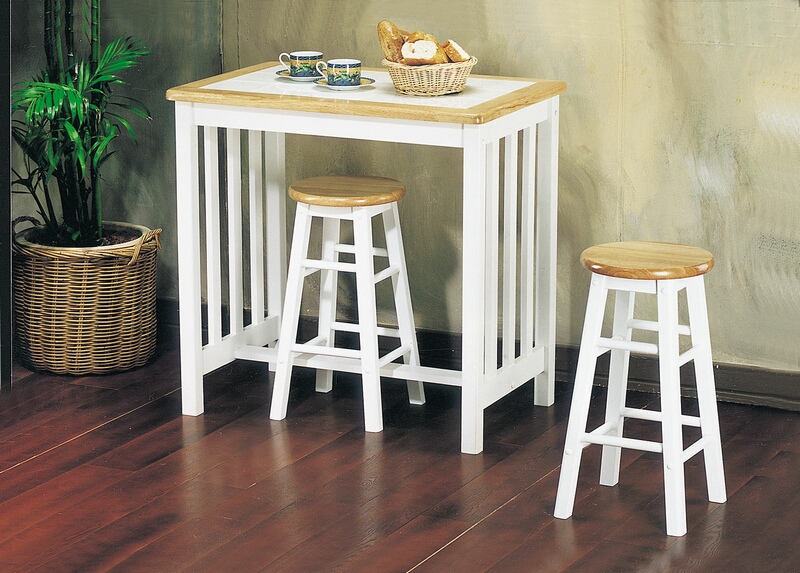 3 pc Metro natural and white finish wood counter height breakfast dining set. This set includes the bar table with white tile top and 2 stools. Measures 22″ x 34″ x 34″ H. Stools measure 24″ H. Some assembly required.