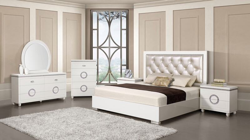 Acme 20240Q 5 pc Vivaldi white high gloss finish wood pearl faux leather queen bedroom set. This set includes the Queen bed set, one nightstand, Dresser, Mirror and Chest. Queen bed measures 85″ x 64″ x 59″ H. Nightstand measures 28″ x 18″ x 26″ H, Dresser measures 63″ x 18″ x 35″ H. Mirror measures 40″ x 45″ H. Chest measures 33″ x 18″ x 52″ H. Some assembly may be required. Eastern king also available at additional cost.