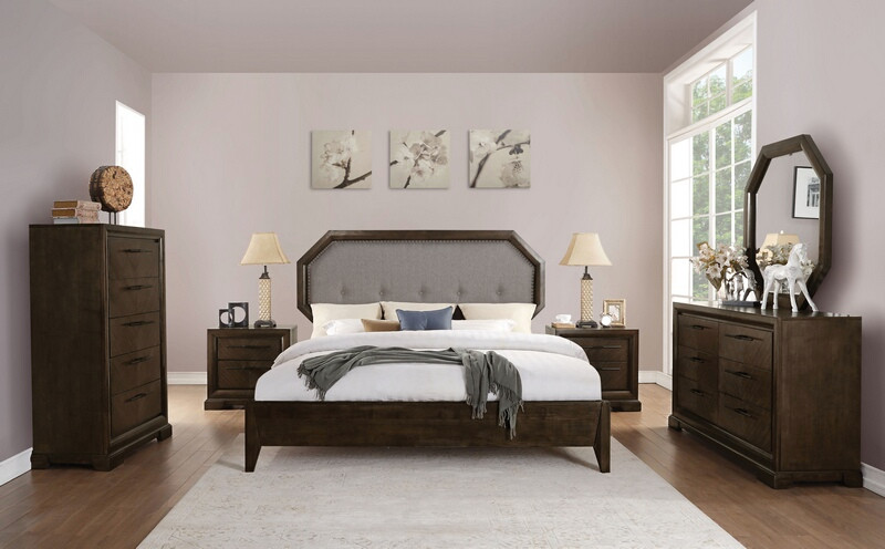 5 pc Selma tobacco finish wood light gray fabric queen bedroom set. This set includes the Queen bed set, one nightstand, Dresser, Mirror and Chest. Queen bed measures 86″ x 63″ x 58″ H. Nightstand measures 28″ x 18″ x 26″ H. Dresser measures 66″ x 19″ x 36″ H. Mirror measures 42″ x 42″ H. Chest measures 39″ x 19″ x 54″ H. Some assembly may be required. Cal King and Eastern king also available at additional cost.
