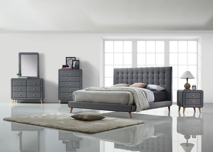 5 pc Valda collection light gray fabric upholstered queen bedroom set. This set includes the bed , nightstand, dresser, chest and mirror. Bed measures 46″ H. Nightstand measures 26″ x 16″ x 22″ H. Dresser measures 43″ x 16″ x 34″ H. Mirror measures 28″ x 36″ H. Chest measures 32″ x 16″ x 46″ H. Some assembly required. Also available in eastern king.