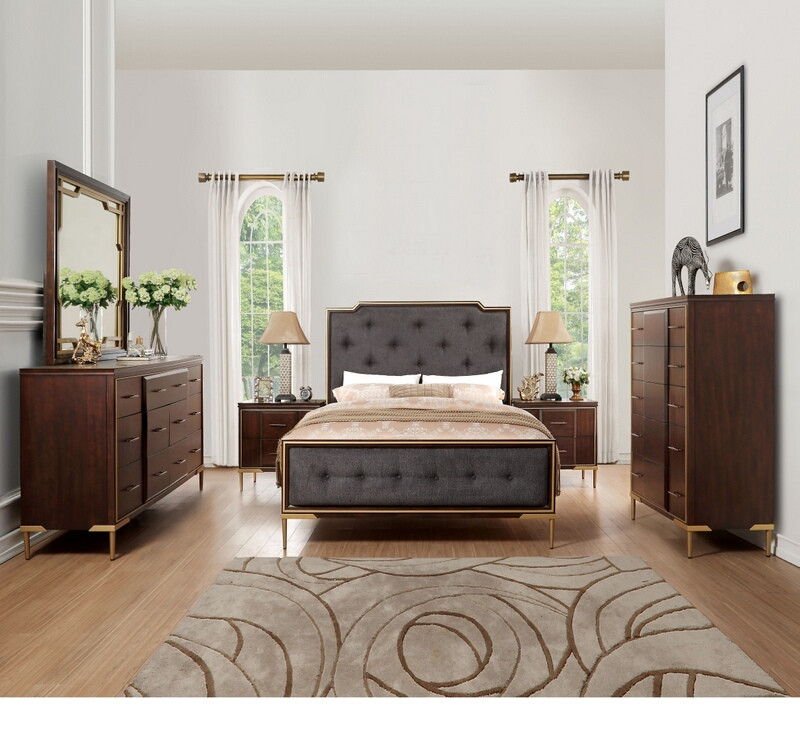 5 pc Eschenbach cherry finish wood gold accents charcoal fabric queen bedroom set. This set includes the Queen bed set, one nightstand, Dresser, Mirror and Chest. Queen bed measures 87″ x 63″ x 61″ H. Nightstand measures 27″ x 18″ x 28″ H. Dresser measures 68″ x 19″ x 38″ H. Mirror measures 41″ x 40″ H. Chest measures 38″ x 19″ x 56″ H. Some assembly may be required. Cal King and Eastern king also available at additional cost.
