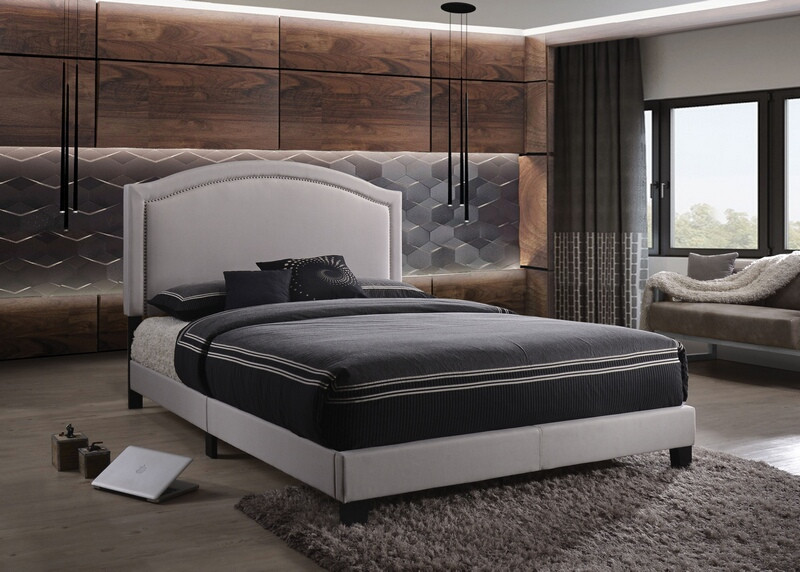 Garresso fog fabric padded nail head trim queen bed set. Bed features an upholstered frame and headboard. Bed measures 85″ x 64″ x 51″ H. Some assembly required.