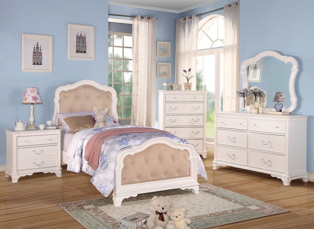 5 pc Ira collection white finish wood button tufted padded twin bedroom set with decorative handles. This set includes the Twin bed with decorative handles, nightstand, dresser, Mirror and Chest. Twin bed measures 54″ H to the top of the headboard. Nightstand measures 27″ x 17″ x 26″ H. Dresser measures 54″ x 18″ x 35″ H. Mirror measures 40″ x 36″ . Chest measures 34″ x 18″ x 48″ H. Also available in full size , and additional pieces also available separately. Some assembly required.