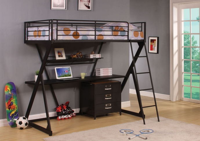 Zazie ii sandy black metal finish lower desk and shelf twin loft bed. Measures 77″ x 41″ x 72″ H. Some assembly required.