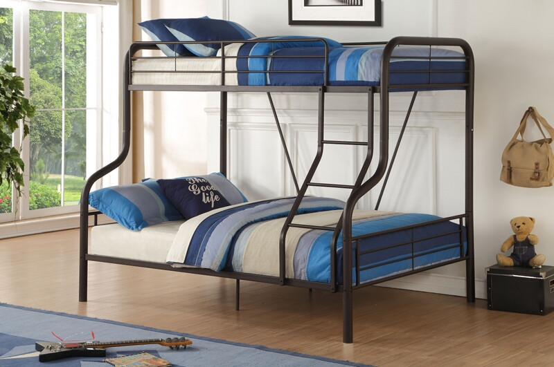 Cairo sandy brown finish metal frame twin over full bunk bed. Measures 79″ x 57″ x 63″ H. Some assembly required.