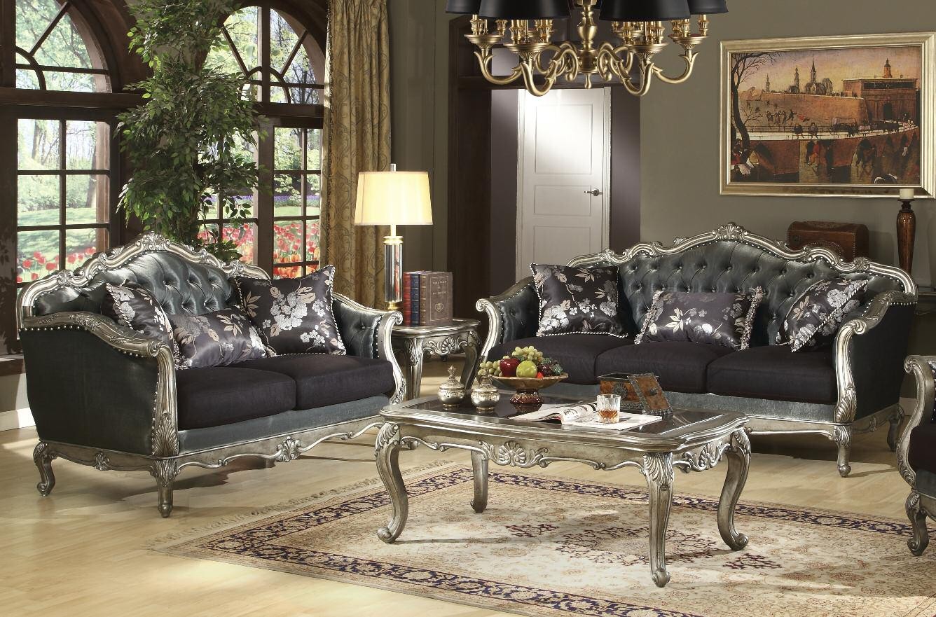 2 pc Chantelle collection antique silver finish wood tufted back seats sofa and love seat set. This set includes the Sofa and love seat with tufted backs and throw pillows, with carved accents and nail nead trim. Sofa measures 84″ x 37″ x 43″ H. Love seat measures 63″ x 37″ x 43″ H. Some assembly may be required.