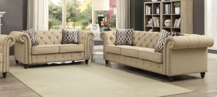Acme 52420-21 2 pc A&J Homes studio nicole aurelia II beige linen like fabric sofa and love seat set tufted backs. Sofa measures 90″ x 33″ x 30 “H. Love seat measures 67″ x 33″ x 30” H. Chair also available separately at additional cost. Some assembly required.