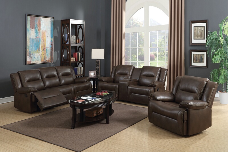 2 pc Romulus espresso leather aire match sofa and love seat with recliner end. This set includes the sofa and love seat with espresso leather aire match upholstery with reclining seats on the love seat and sofa with overstuffed arm rests. Sofa measures 80″ x 37″ x 39″ H. Love seat measures 78″ x 37″ x 39″ H. Optional single recliner also available separately and measures 42″ x 37″ x 39″ H, Some assembly may be required.