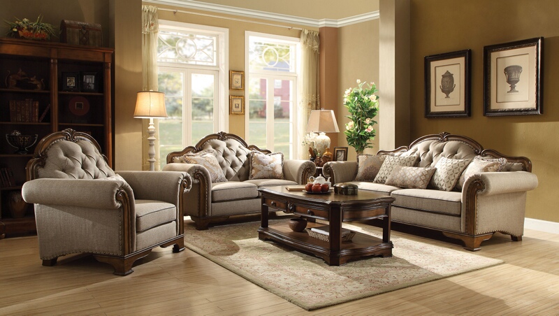 Source: Acme 56170-71 2 pc Valletta latte oak finish wood and fabric sofa and love seat set