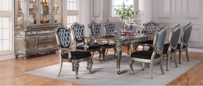 Acme 60540-42-43 7 pc Astoria grand petrin chantelle antique silver finish wood dining table set. This set includes the table with one leaf , 2 – Arm chairs with padded tufted backs, and 4 – side chairs with padded tufted backs. Table measures 44″ x 80″ L ( 96″ L with 1 – 16″ leaf) x 30″ H. Arm chairs measure 26″ x 28″ x 43″ H to the back. Side chairs measure 24″ x 28″ x 43″ H to the back. Additional chairs and Hutch and Buffet also available separately. Some assembly required.