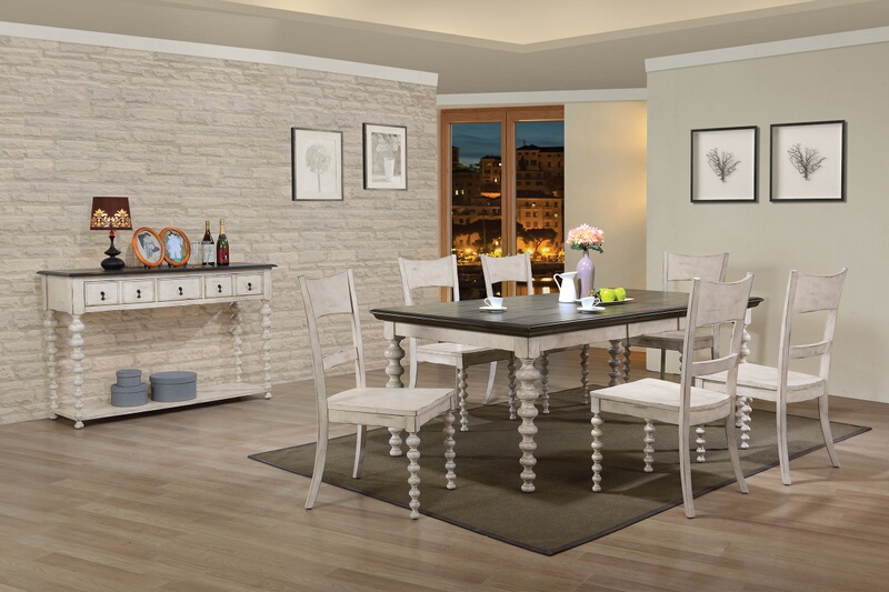 7 pc Coyana antique white / gray finish wood dining table set. This set includes the table and 6 side chairs with rub thru finish. Table measures 42″ x 64″ (82″ with 1 – 18″ leaf ) x 30″ H. Side chairs measure 40″ H to the back. Additional chairs and server also available separately at additional costs. Some assembly required.
