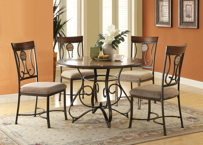 5 pc barrie round faux marble top wood trim edge metal frame dining table set. This set features round table with a faux marble finish with metal frame , 4 – side chairs with a fabric upholstery. Table measures 45″ Dia. x 30″ H. Chairs measure 19″ x 23″ x 40″ H at the back. Some assembly required.