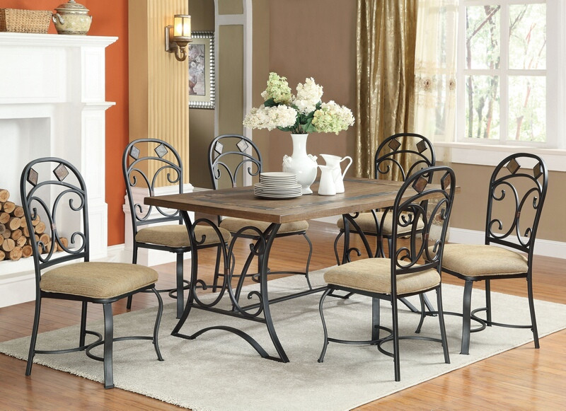 7 pc kiele oak finish wood antique black metal frame dining table set. This set includes the table and 6 side chairs . Table measures 38″ x 64″ x 30″ H. Side chairs measure 19″ x 23″ x 40″ H to the back. Some assembly required.