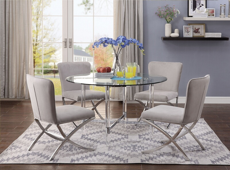 Source: Acme 71180-82 5 pc Daire chrome clear glass top acrylic legs round dining table set