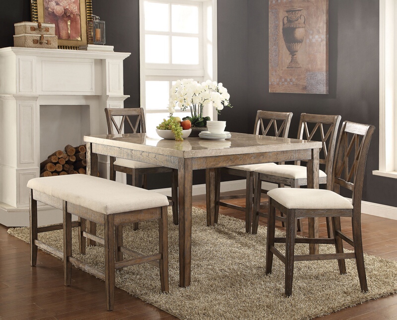 Source: Acme 71720-22-23 6 pc claudia salvage brown finish wood marble top counter height dining table set