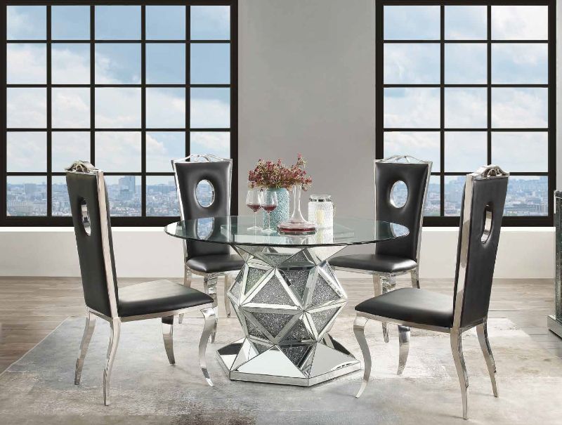 Acme 72145-62078 5 pc Noralie mirrored faux diamonds inlay 52″ round dining table set. This set includes the Table and 4 – side chairs. Table measures 52″ Dia. x 30″H. Side chairs measure 44″ H to the back. Additional chairs also available separately at additional cost. Some assembly required.