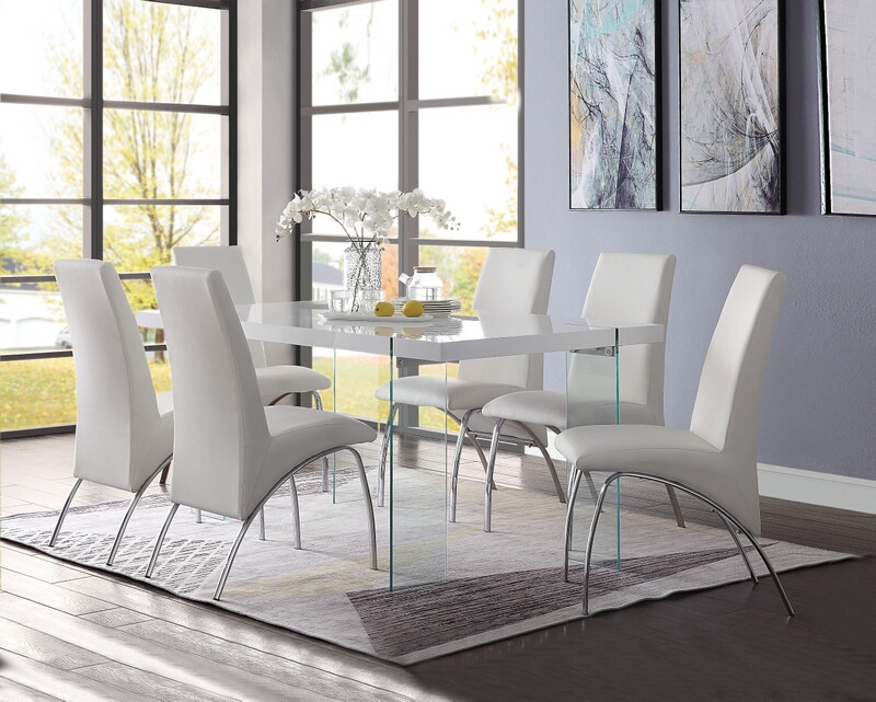 Source: Acme 72185-1107 7 pc Noland white finish wood clear glass legs dining table set