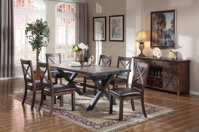 7 pc Earvin weathered oak distressed finish wood dining table set. This set includes the table and 6 side chairs with espresso vinyl upholstered seats . Table measures 38″ x 70″ x 30″ H. Side chairs measure 38″ H to the back. Additional chairs and server also available separately at additional costs. Some assembly required.