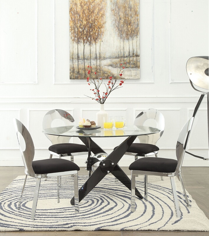 Source: Acme 72325-27 5 pc Hagelin black and chrome metal 48″ round glass top dining table set