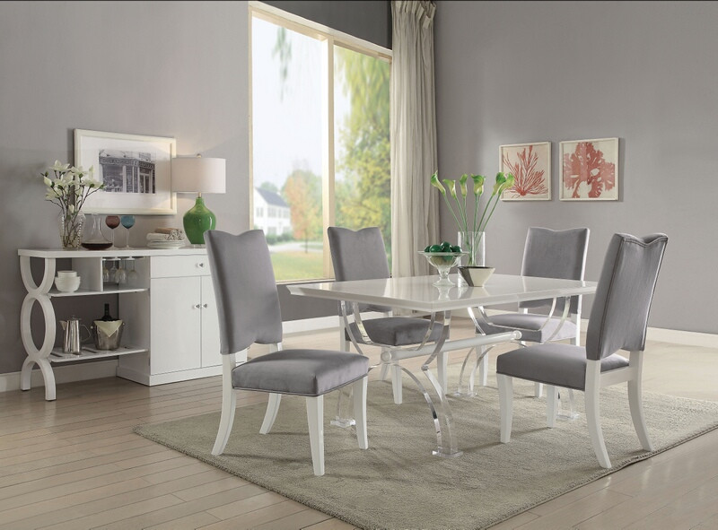 5 pc Martinus white finish wood clear acrylic legs dining table set. This set includes the Dining Table and 4 – side chairs in a gray fabric upholstery. Table measures 38″ x 64″ x 30″ H. Chairs measure 25″ x 21″ x 42″ H to the back . Some assembly required.