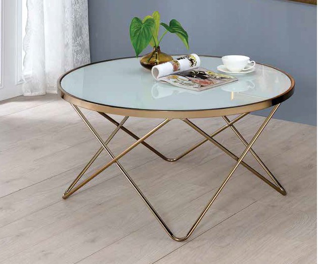 Acme 81825 Wrought studio bock valora frosted glass top champagne finish frame round coffee table. Measures 34″ Dia. x 18″ H. Some assembly required.