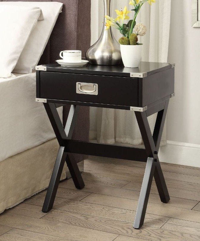 Acme 82822 Ivy bronx durlston babs black finish wood side end table. Metal corner strapping accents. Side table measures 18″ x 16″ x 24″ H. Some assembly required.