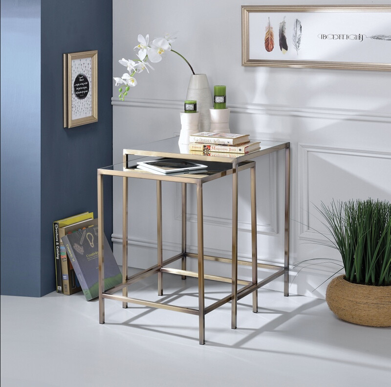 Source: Acme 84475 2 pc Yumia antique brass metal frame glass sofa nesting table set