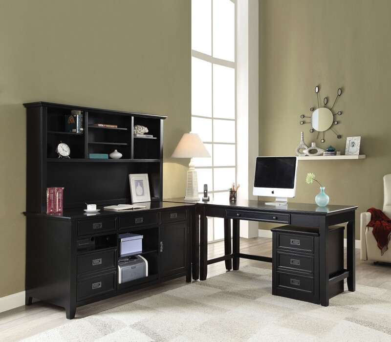 Pandora black finish wood “L” shaped desk set. This desk set features the Credenza desk, hutch, corner desk, office desk and file cabinet. Desk measures 56″ x 26″ x 31″ H. File cabinet 18″ x 22″ x 24″ H. Corner desk measures 26″ x 26″ x 31″ H. Credenza desk measures 60″ x 26″ x 31″ H. Hutch measures 60″ x 10″ x 36″ H. Some assembly required.