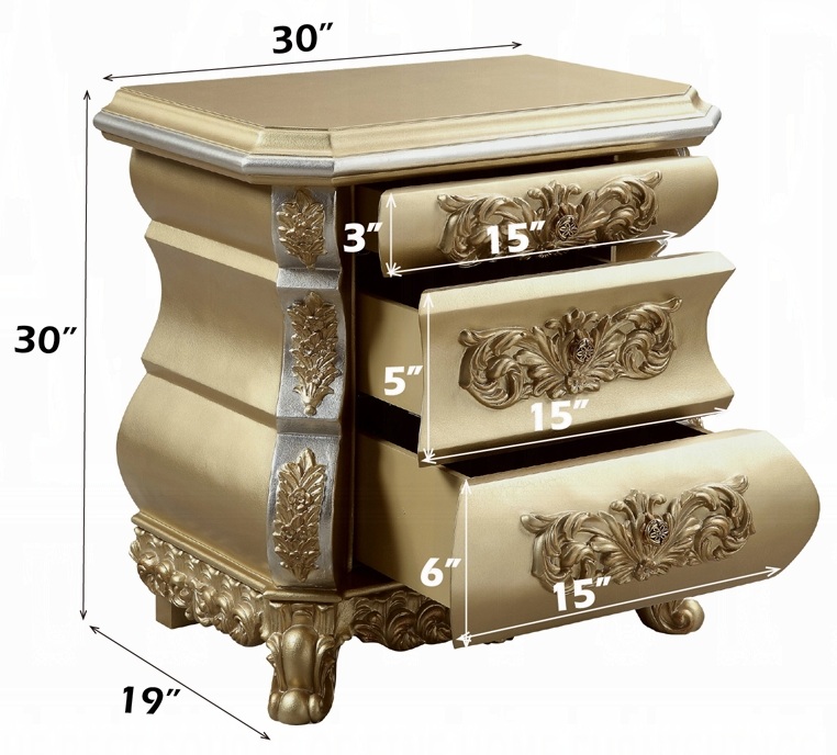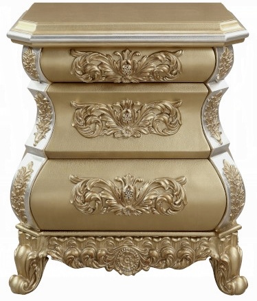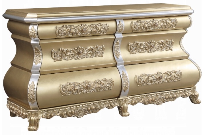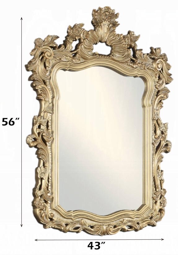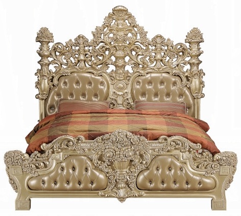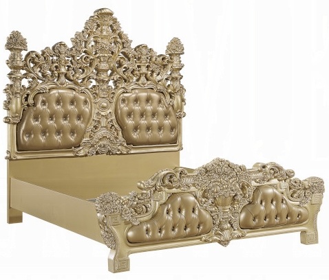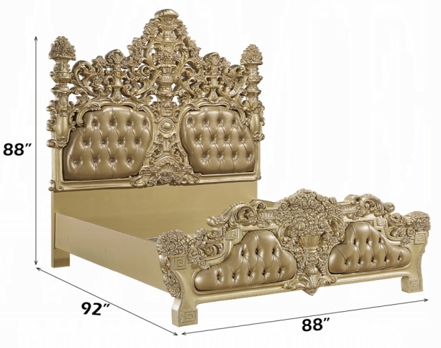 Acme BD00451EK 4 pc Astoria grand seville gold finish wood ornately carved tan faux leather headboard Eastern king bedroom set. This set includes the bed , nightstand, dresser, mirror. Bed measures 92″ x 88″ x 88″ H. Nightstand measures 30″ x 19″ x 30″ H. Dresser measures 75″ x 22″ x 38″ H. Mirror measures 43″ x 4″ x 56″ H. Chest available separately at additional cost and measures 46″ x 22″ x 56″ H. Some assembly required.