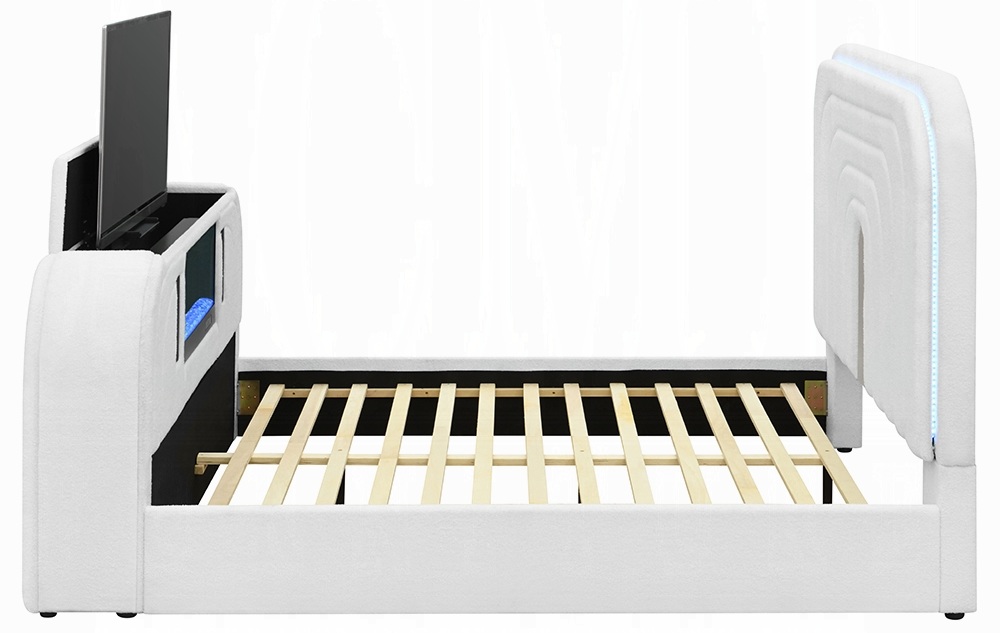 Acme BD04752Q Shelyn white teddy bear sherpa fabric upholstered queen bed set LED , Fireplace and TV Lift. This set includes the Queen bed with LED trim lighting on headboard, (no heat) fireplace light on footboard and TV lift in Footboard. Bed measures 102″ x 65″ x 59″ H. Some assembly may be required. Eastern king also available at additional cost.