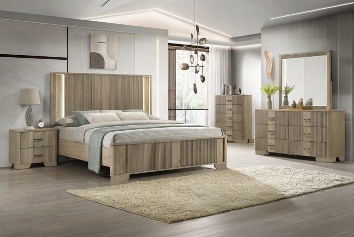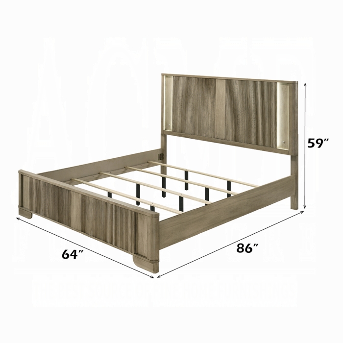 Source: Acme BD04872-4PC Lakkari antique oak finish wood ribbed design headboard modern queen bedroom set LED lighting accents