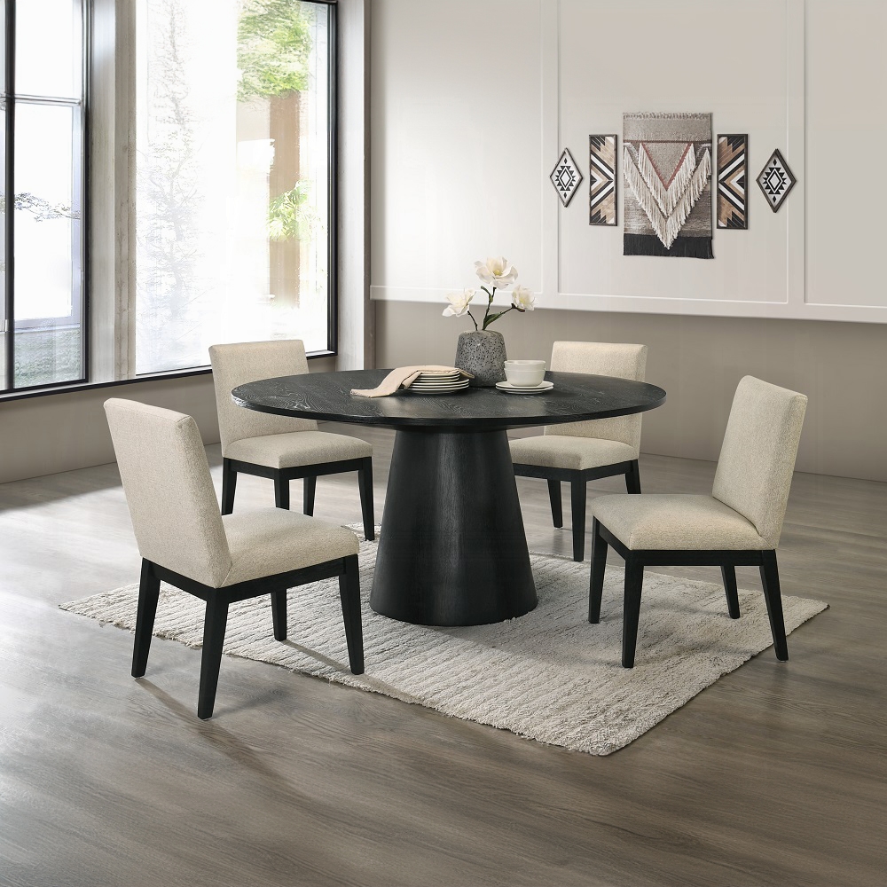 Acme DN01802-5PC 5 pc Charlton home Froja ebony black finish wood 59″ round modern dining table set beige fabric chairs. Set includes table and 4 chairs with padded seats. Table measures 59″ x 30″ H. Chairs measure 19″ x 22.5″ x 34″ H. Additional chairs also available separately. Some assembly required.
